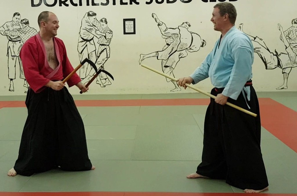 - Butt strike (kama in reverse grip) – step forward into zen and strike with butt, step forward with other foot and strike.